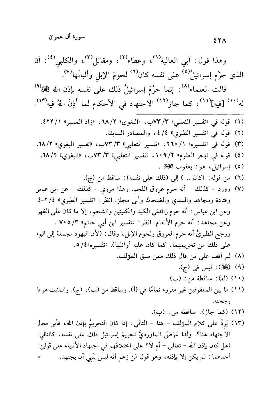 (¬13) يَرِدُ على كلام المؤلف -هنا- التالي: إذا كان التحريمُ بإذن الله، فأين مجال الاجتهاد هنا؟. ولذا عَرَضَ الماورديُّ تحريمَ إسرائيل ذلك على نفسه، كالتالي: (هل كان بإذن الله -تعالى- أم لا؟ على اختلافهم في اجتهاد الأنبياء على قولين: أحدهما: لم يكن إلا بإذنه، وهو قول مَن زعم أنه ليس لِنَبِي أن يجتهد. =