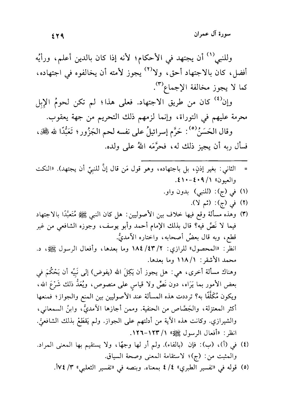 (¬3) وهذه مسألة وقع فيها خلاف بين الأصوليين: هل كان النبي - صلى الله عليه وسلم - مُتَعبَّدًا بالاجتهاد فيما لا نَصَّ فيه؟ قال بذلك الإمام أحمد وأبو يوسف، وجوزه الشافعي من غير قطع، وبه قال بعضُ أصحابه، واختاره الآمديُّ.