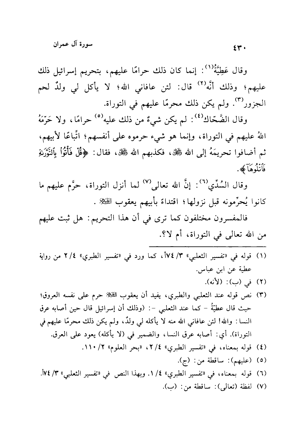 (¬3) نص قوله عند الثعلبي والطبري، يفيد أن يعقوب عليه السلام حرم على نفسه العروق؛ حيث قال عطيّةُ -كما عند الثعلبي-: (وذلك أن إسرائيل قال حين أصابه عرق النسا: والله! لئن عافاني الله منه لا يأكله لي ولدٌ، ولم يكن ذلك محرمًا عليهم في التوراة). أي: أصابه عرق النسا، والضمير في (لا يأكله) يعود على العرق.