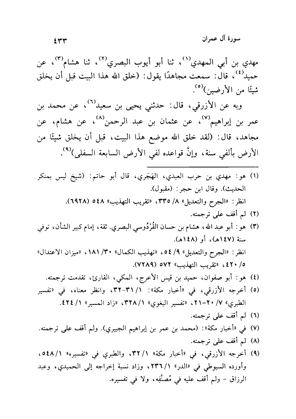 مهدي بن أبي المهدي (¬1)، ثنا أبو أيوب البصري (¬2)، ثنا هشام (¬3)، عن حميد (¬4)، قال: سمعت مجاهدًا يقول: (خلق الله هذا البيت قبل أن يخلق شيئًا من الأرضين) (¬5).
