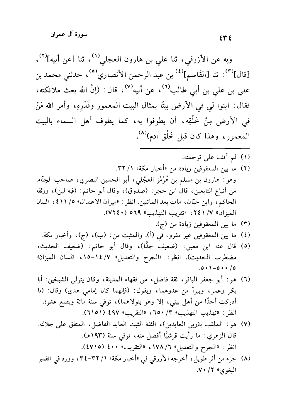وبه عن الأزرقي، ثنا علي بن هارون العجلي (¬1)، ثنا [عن أبيه] (¬2)، [قال] (¬3): ثنا [القَاسم] (¬4) بن عبد الرحمن الأنصاري (¬5)، حدثني محمد بن علي بن علي بن أبي طالب (¬6)، عن أبيه (¬7)، قال: (إنَّ الله بعث ملائكته، فقال: ابنوا لي في الأرض بيتًا بمثال البيت المعمور وقَدْرِهِ، وأمر الله مَنْ في الأرض مِنْ خَلْقِه، أن يطوفوا به، كما يطوف أهل السماء بالبيت المعمور، وهذا كان قبل خَلْق آدم) (¬8).