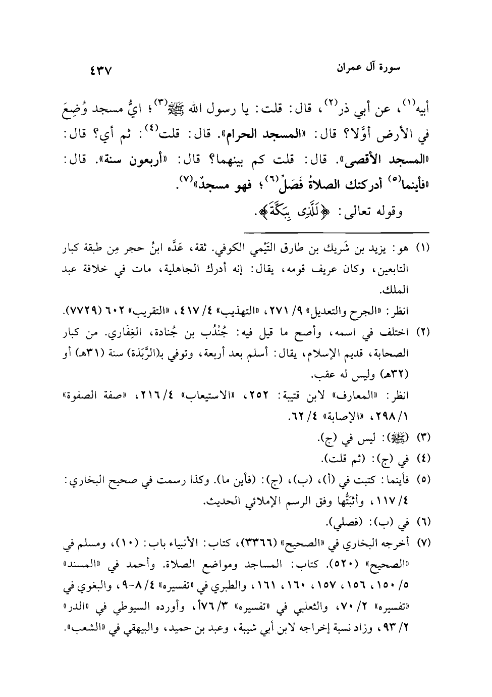 (¬7) أخرجه البخاري في "الصحيح" (3366)، كتاب: الأنبياء باب: (10)، ومسلم في "الصحيح" (520). كتاب: المساجد ومواضع الصلاة. وأحمد في "المسند" 5/ 150، 156، 157، 160، 161، والطبري في "تفسيره" 4/ 8 - 9، والبغوي في "تفسيره" 2/ 70، والثعلبي في "تفسيره" 3/ 76 أ، وأورده السيوطي في "الدر" 2/ 93، وزاد نسبة إخراجه لابن أبي شيبة، وعبد بن حميد، والبيهقي في "الشعب".