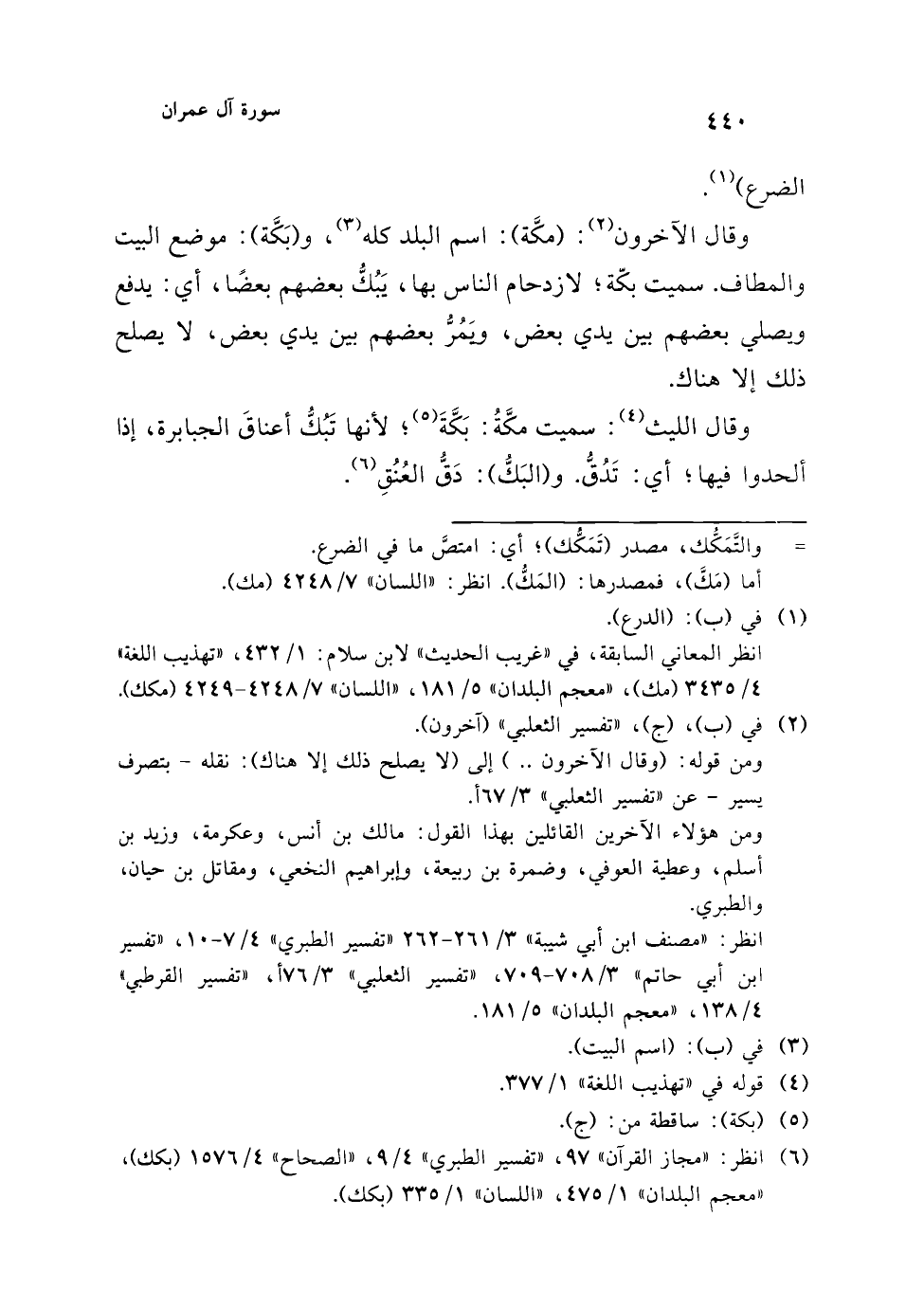 (¬6) انظر: "مجاز القرآن" 97، "تفسير الطبري" 4/ 9، "الصحاح" 4/ 1576 (بكك)، "معجم البلدان" 1/ 475، "اللسان" 1/ 335 (بكك).
