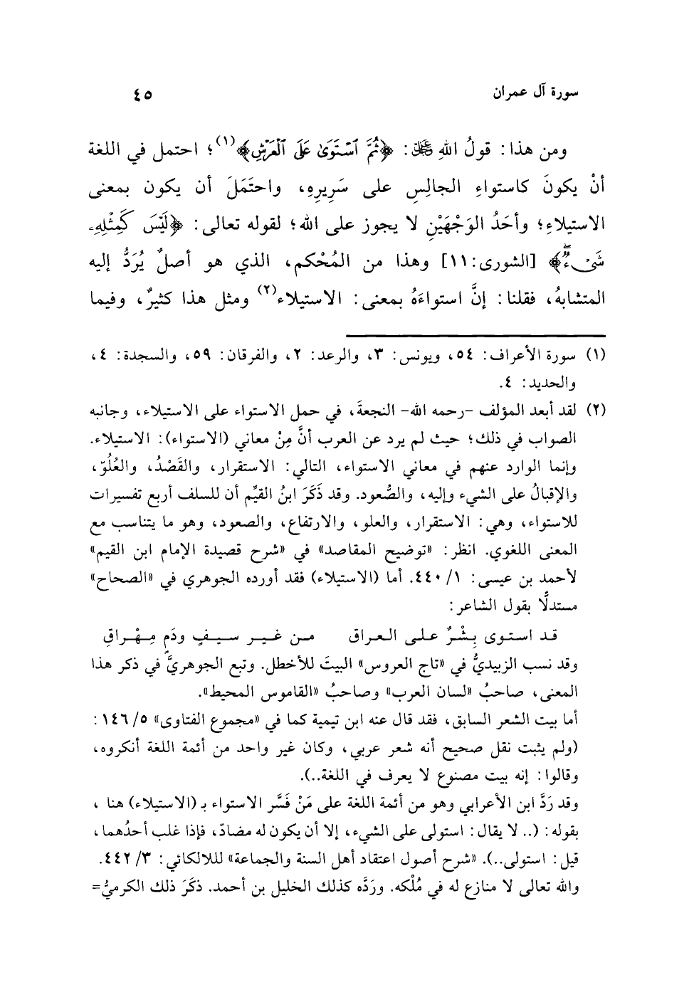 (¬2) لقد أبعد المؤلف -رحمه الله- النجعةَ، في حمل الاستواء على الاستيلاء، وجانبه الصواب في ذلك؛ حيث لم يرد عن العرب أنَّ مِنْ معاني (الاستواء): الاستيلاء. وإنما الوارد عنهم في معاني الاستواء، التالي: الاستقرار، والقَصْدُ، والعُلُوّ، والإقبالُ على الشيء وإليه، والصُّعود. وقد ذَكَرَ ابنُ القيِّم أن للسلف أربع تفسيرات للاستواء، وهي: الاستقرار، والعلو، والارتفاع، والصعود، وهو ما يتناسب مع المعنى اللغوي. انظر: "توضيح المقاصد" في "شرح قصيدة الإمام ابن القيم" لأحمد بن عيسى: 1/ 440. أما (الاستيلاء) فقد أورده الجوهري في "الصحاح" مستدلًا بقول الشاعر: