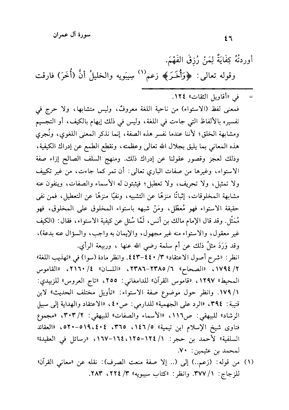 انظر: "شرح أصول الاعتقاد" 3/ 440 - 443. وانظر مادة (سوا) في "تهذيب اللغة" 2/ 1794، "الصحاح" 6/ 2385 - 2386، "اللسان" 4/ 2160، "القاموس المحيط" 1297، "قاموس القرآن" للدامغاني: 255، "تاج العروس" للزبيدي: 1/ 179. وانظر حول موضوع صفة الاستواء: "تأويل مختلف الحديث" لابن قتيبة: 394، "الرد على الجهمية" للدارمي: ص 40، "الاعتقاد والهداية إلى سبيل الرشاد" للبيهقي: ص 116، "الأسماء والصفات" للبيهقي: 2/ 303، "مجموع فتاوى شيخ الإسلام ابن تيمية" 5/ 146، 365 ,404، 519 - 520 "العقائد السلفية" لأحمد بن حجر: 1/ 124 - 125، 164 - 167، "رسائل في العقيدة" لمحمد بن عثيمين: 70.
