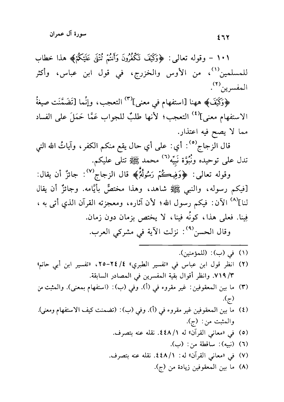101 - وقوله تعالى: {وَكَيْفَ تَكْفُرُونَ وَأَنْتُمْ تُتْلَى عَلَيْكُمْ} هذا خطاب للمسلمين (¬1)، من الأوس والخزرج، في قول ابن عباس، وأكثر المفسرين (¬2).