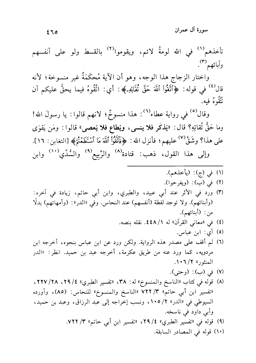 واختار الزجاج هذا الوجه، وهو أن الآية مُحكَمَةٌ غير منسوخة؛ لأنه قال (¬4) في قوله: {اتَّقُوا اللَّهَ حَقَّ تُقَاتِهِ}: أي: اتَّقُوهُ فيما يحقُّ عليكم أن تتَّقُوهُ فيه.