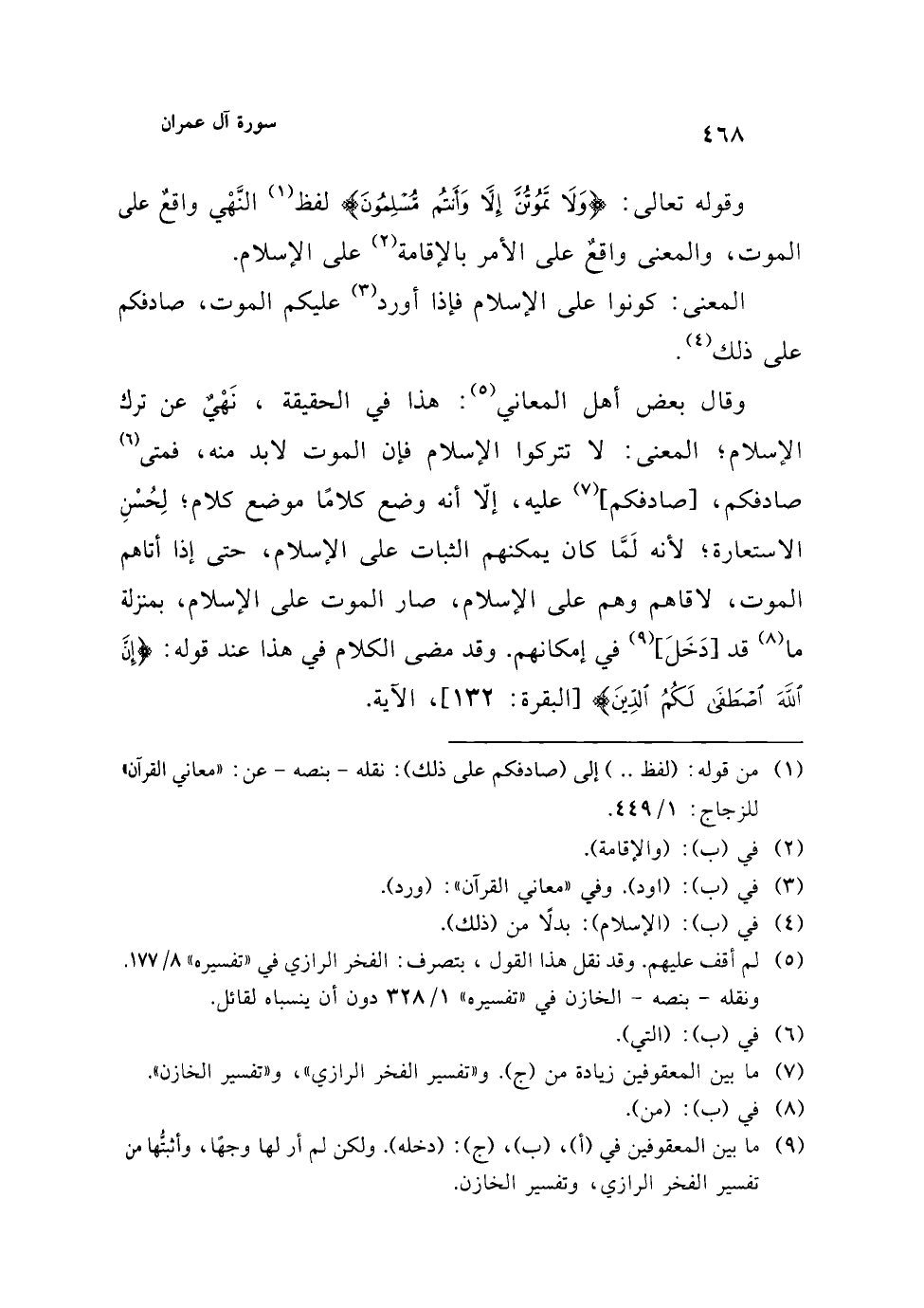 وقال بعض أهل المعاني (¬5): هذا في الحقيقة، نَهْيٌ عن ترك الإسلام؛ المعنى: لا تتركوا الإسلام فإن الموت لابد منه، فمتى (¬6) صادفكم، [صادفكم] (¬7) عليه، إلّا أنه وضع كلامًا موضع كلام؛ لِحُسْنِ الاستعارة؛ لأنه لَمَّا كان يمكنهم الثبات على الإسلام، حتى إذا أتاهم الموت، لاقاهم وهم على الإسلام، صار الموت على الإسلام، بمنزلة ما (¬8) قد [دَخَلَ] (¬9) في إمكانهم. وقد مضى الكلام في هذا عند قوله: {إِنَّ اللَّهَ اصْطَفَى لَكُمُ الدِّين} [البقرة: 132]، الآية.