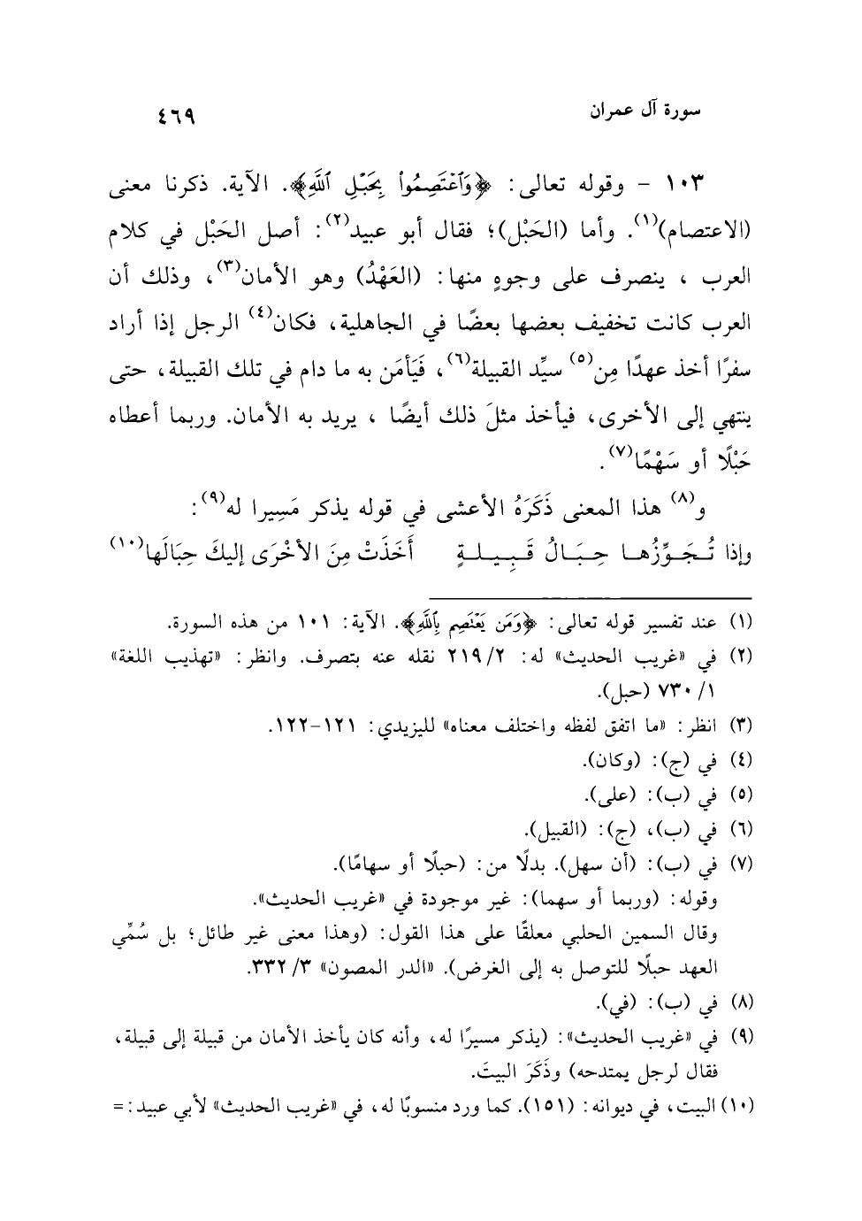 103 - وقوله تعالى: {وَاعْتَصِمُوا بِحَبْلِ اللَّهِ}. الآية. ذكرنا معنى (الاعتصام) (¬1). وأما (الحَبْل)؛ فقال أبو عبيد (¬2): أصل الحَبْل في كلام العرب، ينصرف على وجوهٍ منها: (العَهْدُ) وهو الأمان (¬3)، وذلك أن العرب كانت تخفيف بعضها بعضًا في الجاهلية، فكان (¬4) الرجل إذا أراد سفرًا أخذ عهدًا مِن (¬5) سيِّد القبيلة (¬6)، فَيَأمَن به ما دام في تلك القبيلة، حتى ينتهي إلى الأخرى، فيأخذ مثلَ ذلك أيضًا، يريد به الأمان. وربما أعطاه حَبْلًا أو سَهْمًا (¬7).