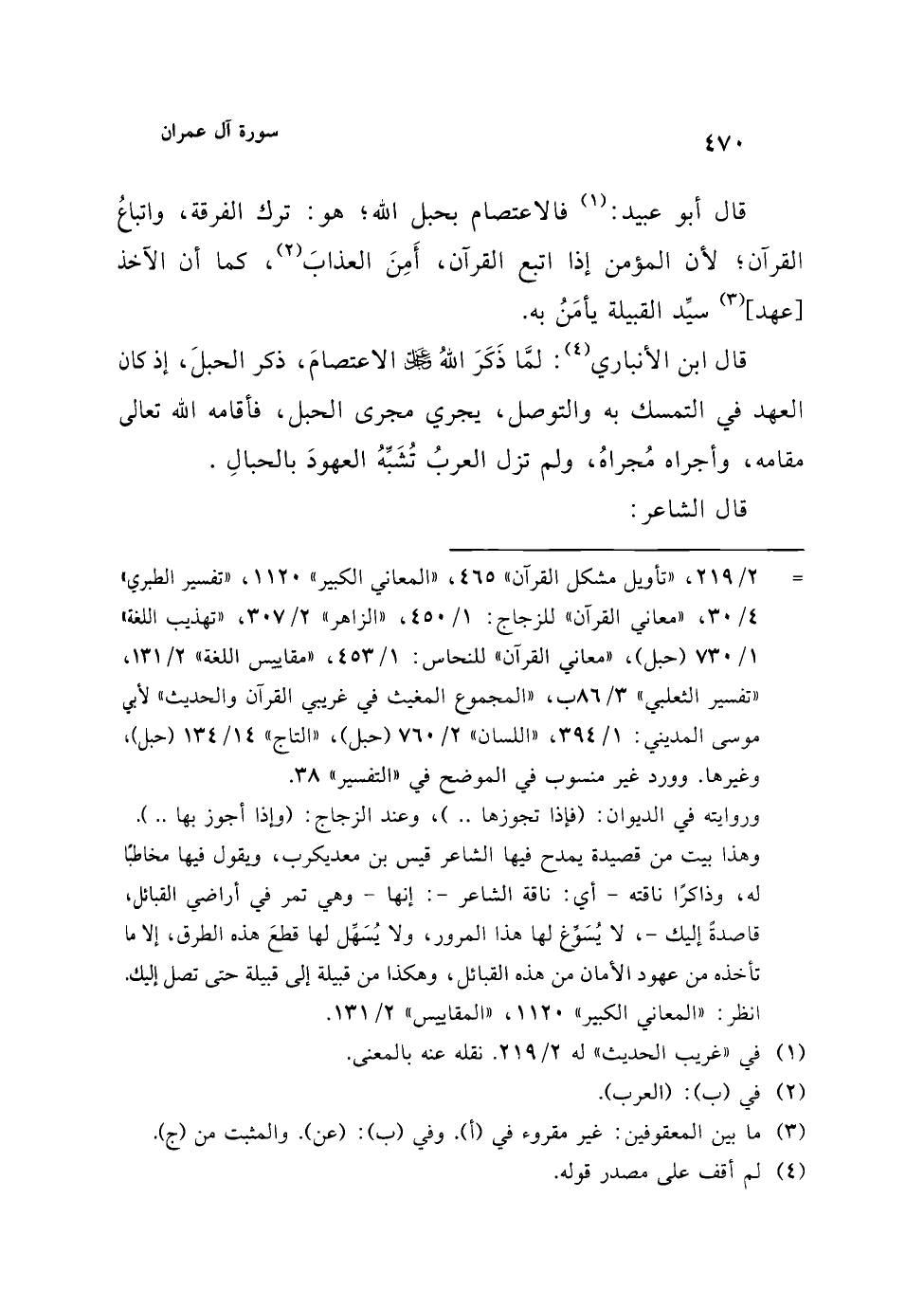 = 2/ 219، "تأويل مشكل القرآن" 465، "المعاني الكبير" 1120، "تفسير الطبري" 4/ 30، "معاني القرآن" للزجاج: 1/ 450، "الزاهر" 2/ 307، "تهذيب اللغة" 1/ 730 (حبل)، "معاني القرآن" للنحاس: 1/ 453، "مقاييس اللغة" 2/ 131، "تفسير الثعلبي" 3/ 86 ب، "المجموع المغيث في غريبي القرآن والحديث" لأبي موسى المديني: 1/ 394، "اللسان" 2/ 760 (حبل)، "التاج" 14/ 134 (حبل)، وغيرها. وورد غير منسوب في الموضع في " التفسير" 38.