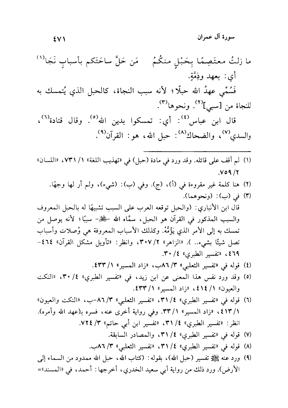 فَسُمَي عهدُ الله حبلًا؛ لأنه سبب النجاة، كالحبل الذي يُتمسك به للنجاة من [سبي] (¬2). ونحوها (¬3).