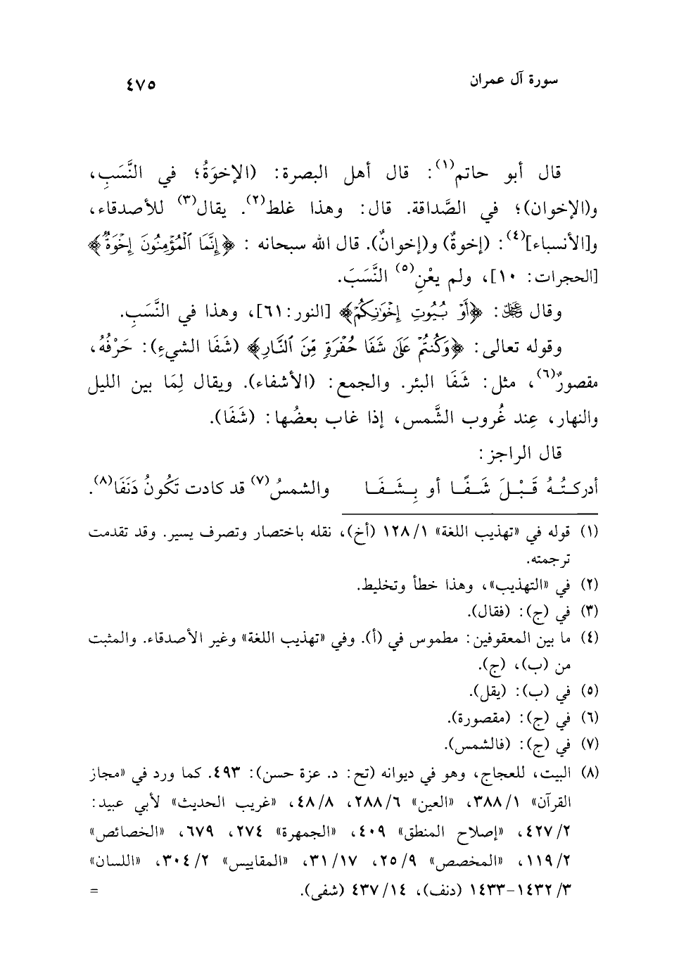 وقال عز وجل: {أَوْ بُيُوتِ إِخْوَانِكُمْ} [النور: 61]، وهذا في النَّسَبِ. وقوله تعالى: {وَكُنْتُمْ عَلَى شَفَا حُفْرَةٍ مِنَ النَّارِ} (شَفَا الشيءِ): حَرْفُهُ، مقصورٌ (¬6)، مثل: شَفَا البئر. والجمع: (الأشفاء). ويقال لِمَا بين الليل والنهار، عِند غُروب الشَّمس، إذا غاب بعضها: (شَفَا).