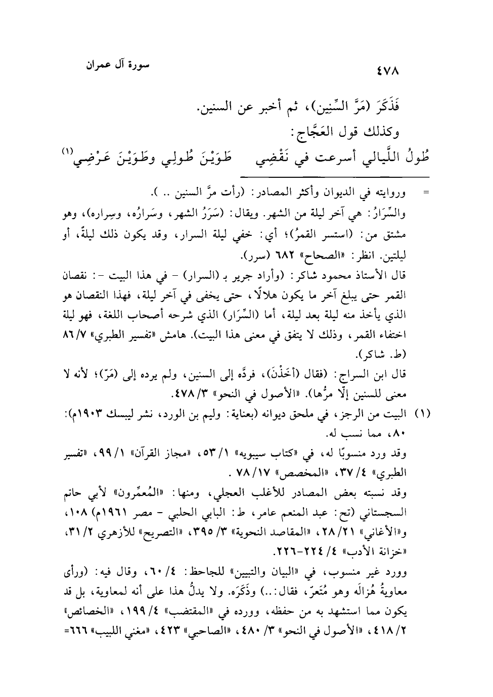 قال الأستاذ محمود شاكر: (وأراد جرير بـ (السرار) -في هذا البيت-: نقصان القمر حتى يبلغ آخر ما يكون هلالًا، حتى يخفى في آخر ليلة، فهذا النقصان هو الذي يأخذ منه ليلة بعد ليلة، أما (السِّرَار) الذي شرحه أصحاب اللغة، فهو ليلة اختفاء القمر، وذلك لا يتفق في معنى هذا البيت). هامش "تفسير الطبري" 7/ 86 (ط. شاكر).