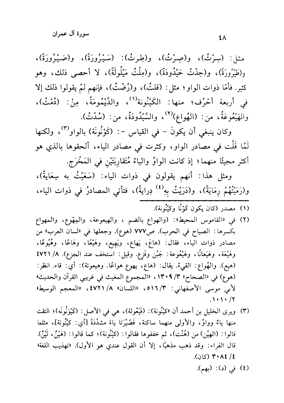مثل: (سِرْتُ)، و (صرْتُ)، و (طِرتُ): (سَيْرُورَةً)، و (صَيْرُورَةً)، و (طَيْرُورَةً)، و (حِدْتُ حَيْدُودَةً)، و (مِلْتُ مَيْلُولَةً)، لا أحصى ذلك، وهو كثير. فأمّا ذوات الواو؛ مثل: (قلتُ)، و (رُضْتُ)، فإنهم لمْ يقولوا ذلك إلا في أربعة أحْرُف، منها: الكَيْنُونة (¬1)، والدَّيْمُومَةُ، مِنْ: (دُمْتُ)، والهَيْعُوعَةُ، من: (الهُواع) (¬2)، والسيْدُودَةُ، من: (سُدْتُ).