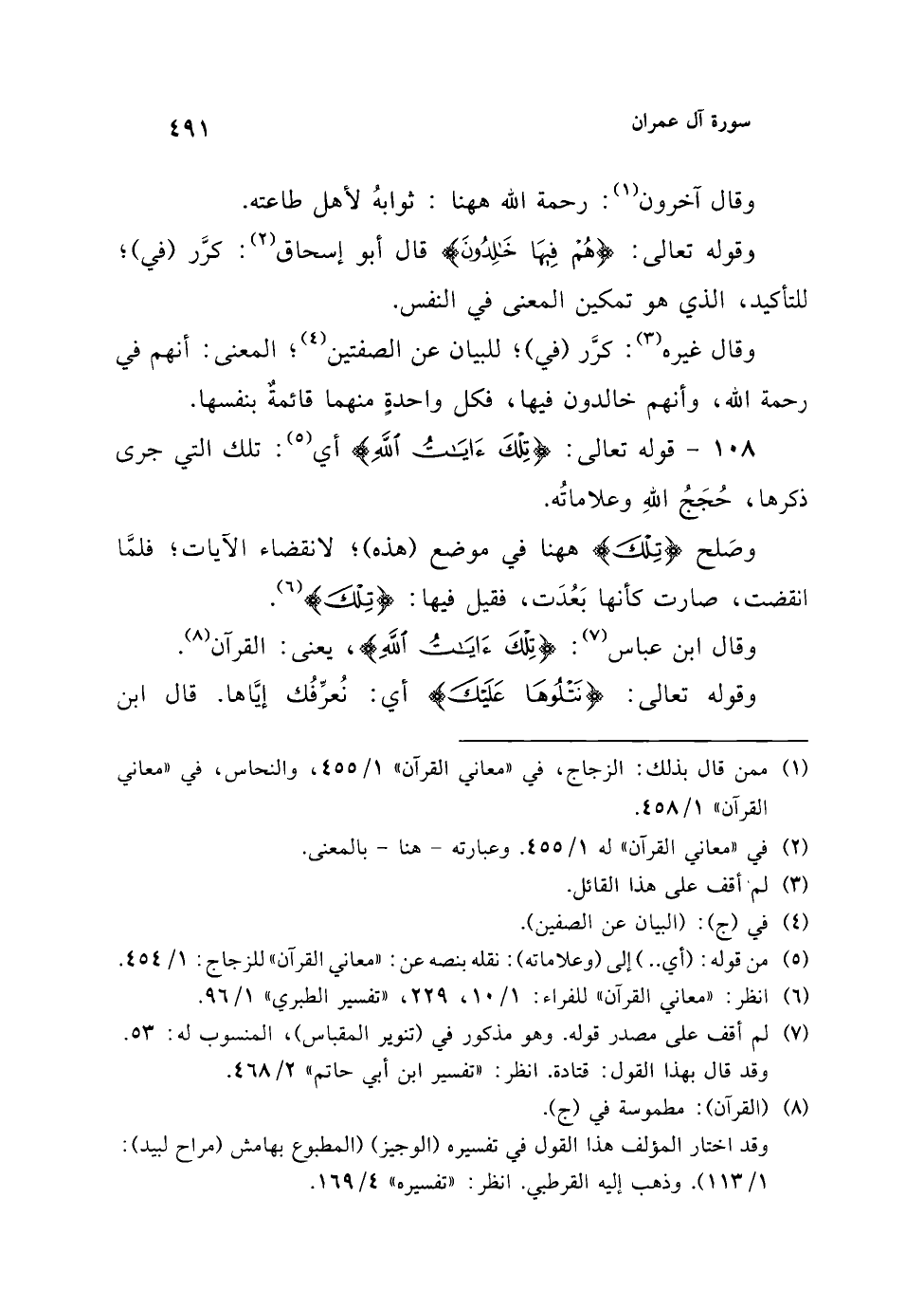 108 - قوله تعالى: {تِلْكَ آيَاتُ اللَّهِ} أي (¬5): تلك التي جرى ذكرها، حُجَجُ اللهِ وعلاماتُه.