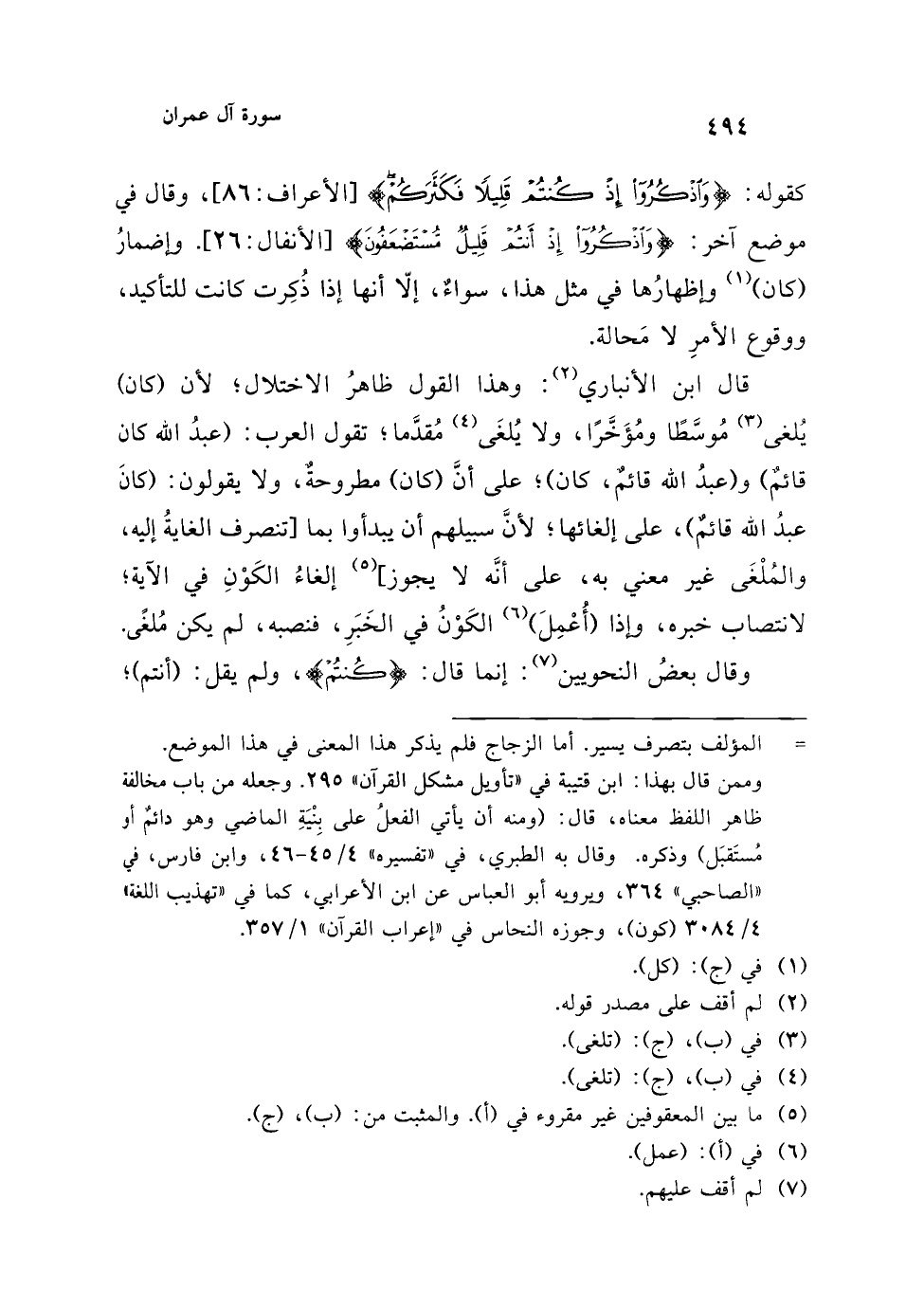 قال ابن الأنباري (¬2): وهذا القول ظاهرُ الاختلال؛ لأن (كان) يُلغى (¬3) مُوسَّطًا ومُؤَخَّرًا، ولا يُلغَى (¬4) مُقدَّما؛ تقول العرب: (عبدُ الله كان قائمٌ) و (عبدُ الله قائمٌ، كان)؛ على أنَّ (كان) مطروحة، ولا يقولون: (كانَ عبدُ الله قائمٌ)، على إلغائها، لأنَّ سبيلهم أن يبدأوا بما [تنصرف الغايةُ إليه، والمُلْغَى غير معني به، على أنَّه لا يجوز] (¬5) إلغاءُ الكَوْنِ في الآية؛ لانتصاب خبره، وإذا (أُعْمِلَ) (¬6) الكَوْنُ في الخَبَرِ، فنصبه، لم يكن مُلغًى.