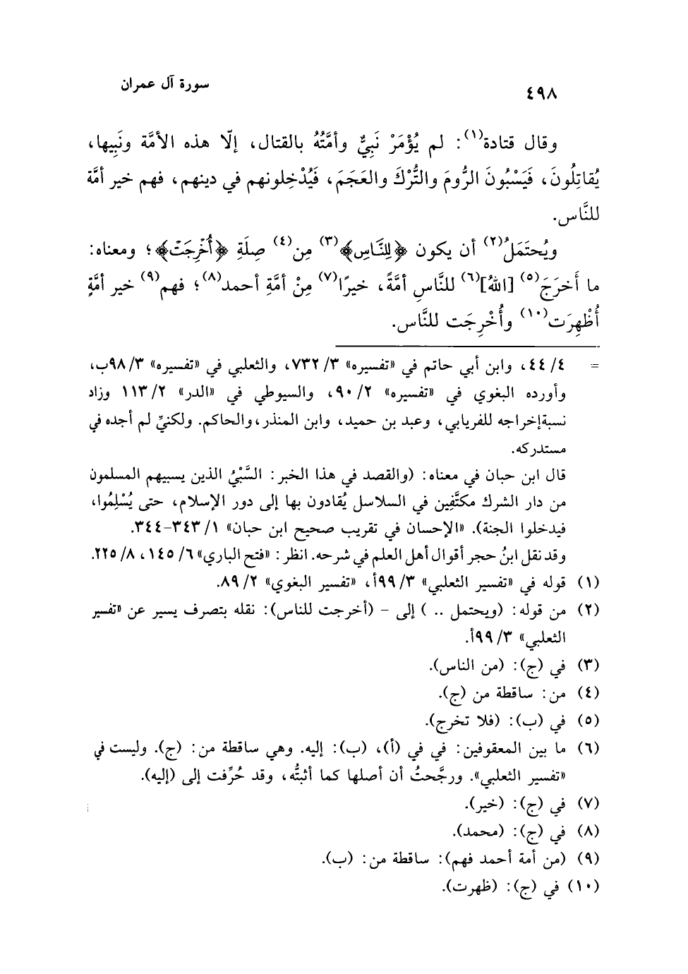 (¬2) من قوله: (ويحتمل ..) إلى- (أخرجت للناس): نقله بتصرف يسير عن "تفسير الثعلبي" 3/ 99 أ.