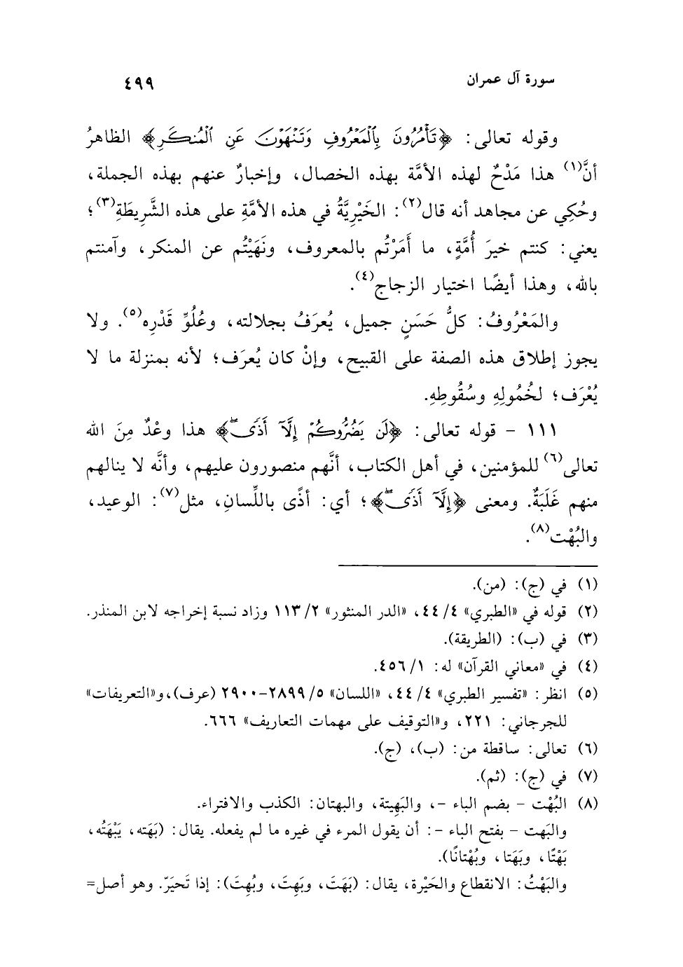 (¬5) انظر: "تفسير الطبري" 4/ 44، "اللسان" 5/ 2899 - 2900 (عرف)، و"التعريفات" للجرجاني: 221، و"التوقيف على مهمات التعاريف" 666.