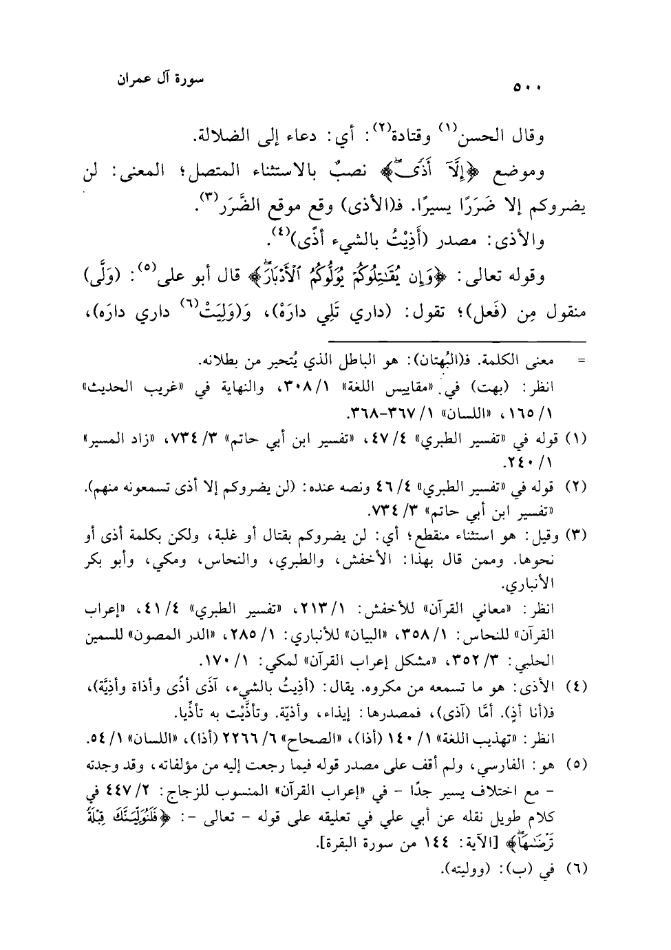 (¬2) قوله في "تفسير الطبري" 4/ 46 ونصه عنده: (لن يضروكم إلا أذى تسمعونه منهم). "تفسير ابن أبي حاتم" 3/ 734.