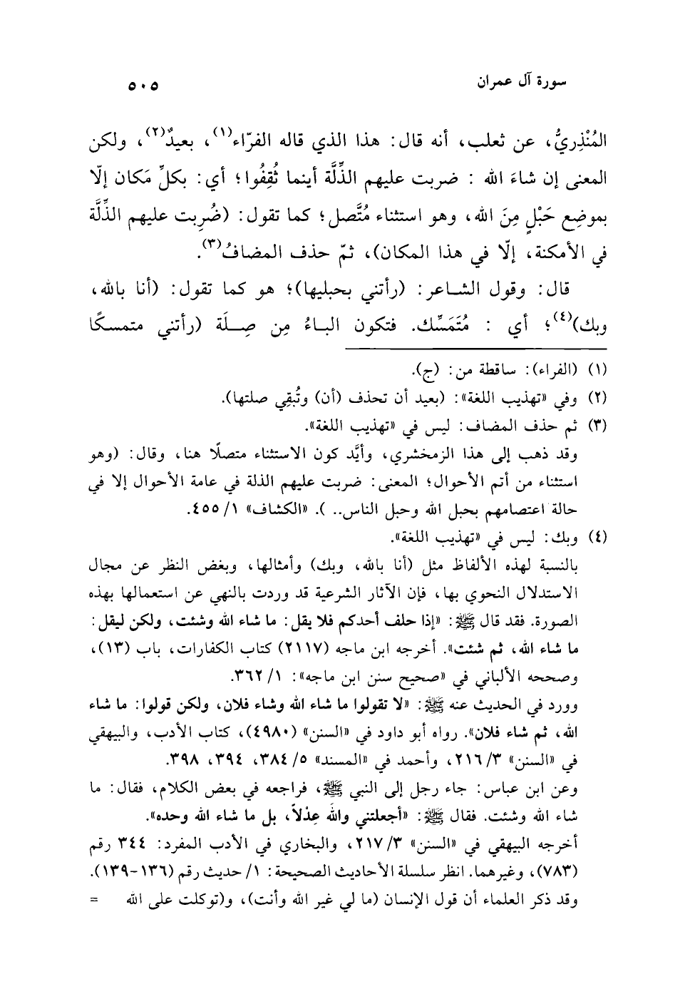 المُنْذِريُّ، عن ثعلب، أنه قال: هذا الذي قاله الفرّاء (¬1)، بعيدٌ (¬2)، ولكن المعنى إن شاءَ الله: ضربت عليهم الذِّلَّة أينما ثُقِفُوا؛ أي: بكلِّ مَكان إلّا بموضِع حَبْلٍ مِنَ الله، وهو استثناء مُتَّصل، كما تقول: (ضُرِبت عليهم الذِّلَّة في الأمكنة، إلّا في هذا المكان)، ثمّ حذف المضافُ (¬3).