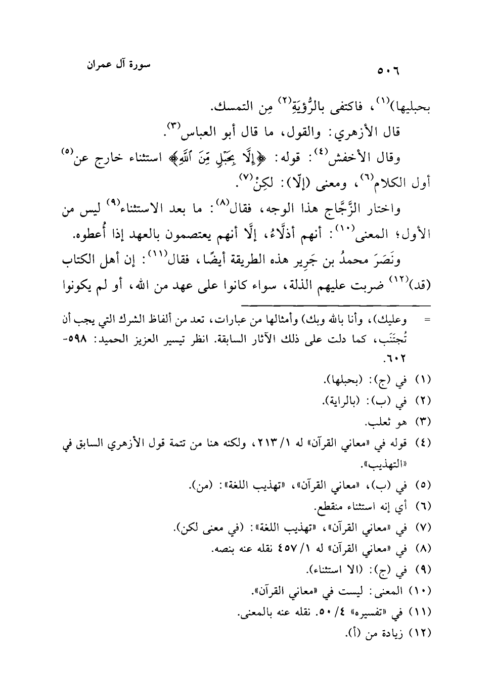 (¬4) قوله في "معاني القرآن" له 1/ 213، ولكنه هنا من، تتمة قول الأزهري السابق في "التهذيب".