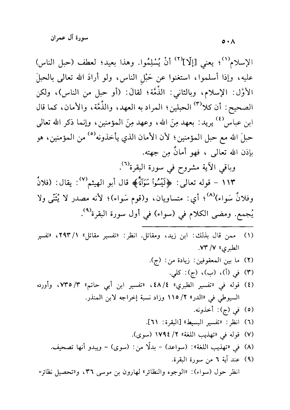 113 - قوله تعالى: {لَيْسُوا سَوَآءً} قال أبو الهيثم (¬7): يقال: (فلانٌ وفلانٌ سَواء) (¬8)؛ أي: متساويان، و (قوم سَواء)؛ لأنه مصدر لا يُثَنّى ولا يُجمع. ومضى الكلام في (سواء) في أول سورة البقرة (¬9).