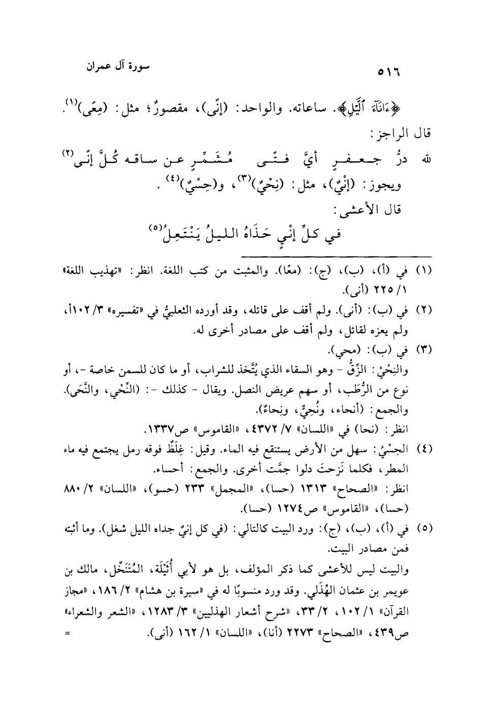 {آنَاءَ اللَّيْلِ}. ساعاته. والواحد: (إنًى)، مقصورٌ؛ مثل: (مِعًى) (¬1). قال الراجز: