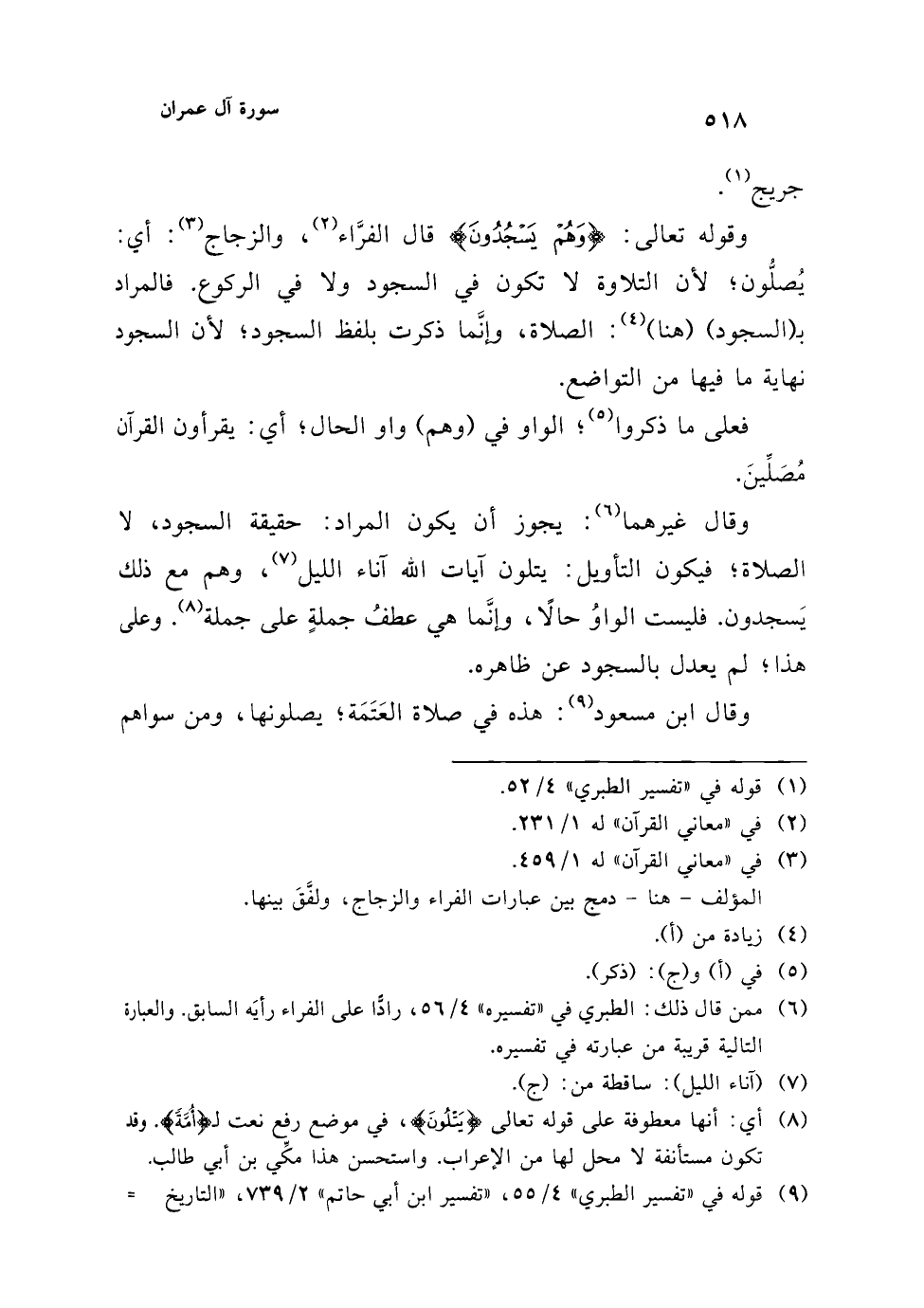 وقال غيرهما (¬6): يجوز أن يكون المراد: حقيقة السجود، لا الصلاة؛ فيكون التأويل: يتلون آيات الله آناء الليل (¬7)، وهم مع ذلك يَسجدون. فليست الواوُ حالًا، وإنَّما هي عطف جملةٍ على جملة (¬8). وعلى هذا؛ لم يعدل بالسجود عن ظاهره.