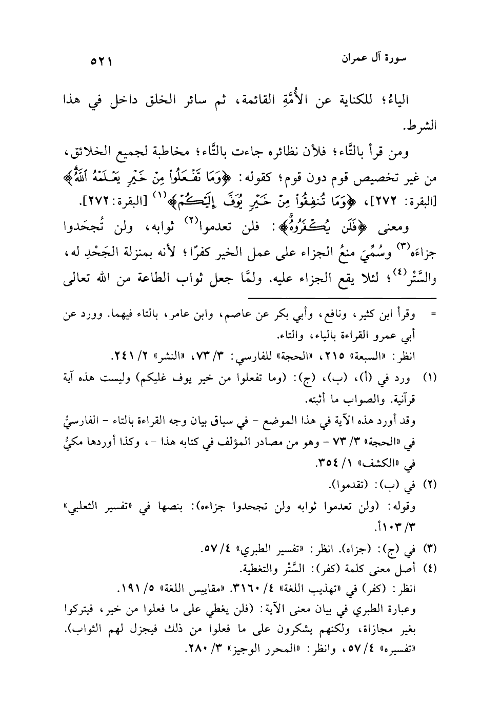 وعبارة الطبري في بيان معنى الآية: (فلن يغطي على ما فعلوا من خير، فيتركوا بغير مجازاة، ولكنهم يشكرون على ما فعلوا من ذلك فيجزل لهم الثواب). "تفسيره" 4/ 57، وانظر: "المحرر الوجيز" 3/ 280.