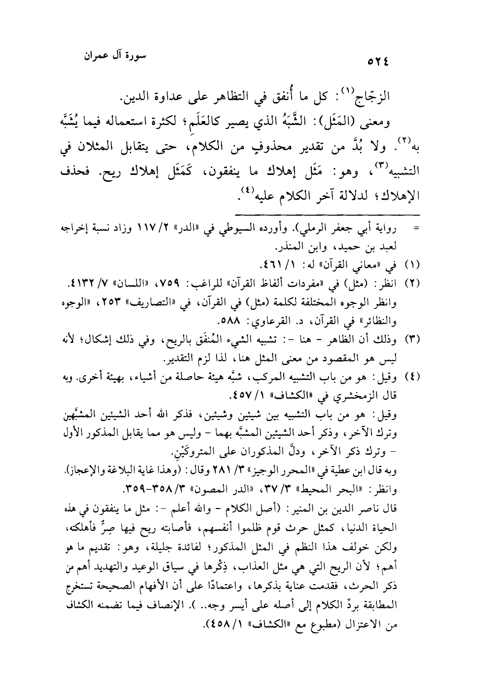 (¬3) وذلك أن الظاهر -هنا-: تشبيه الشيء المُنفَق بالريح، وفي ذلك إشكال؛ لأنه ليس هو المقصود من معنى المثل هنا، لذا لزم التقدير.