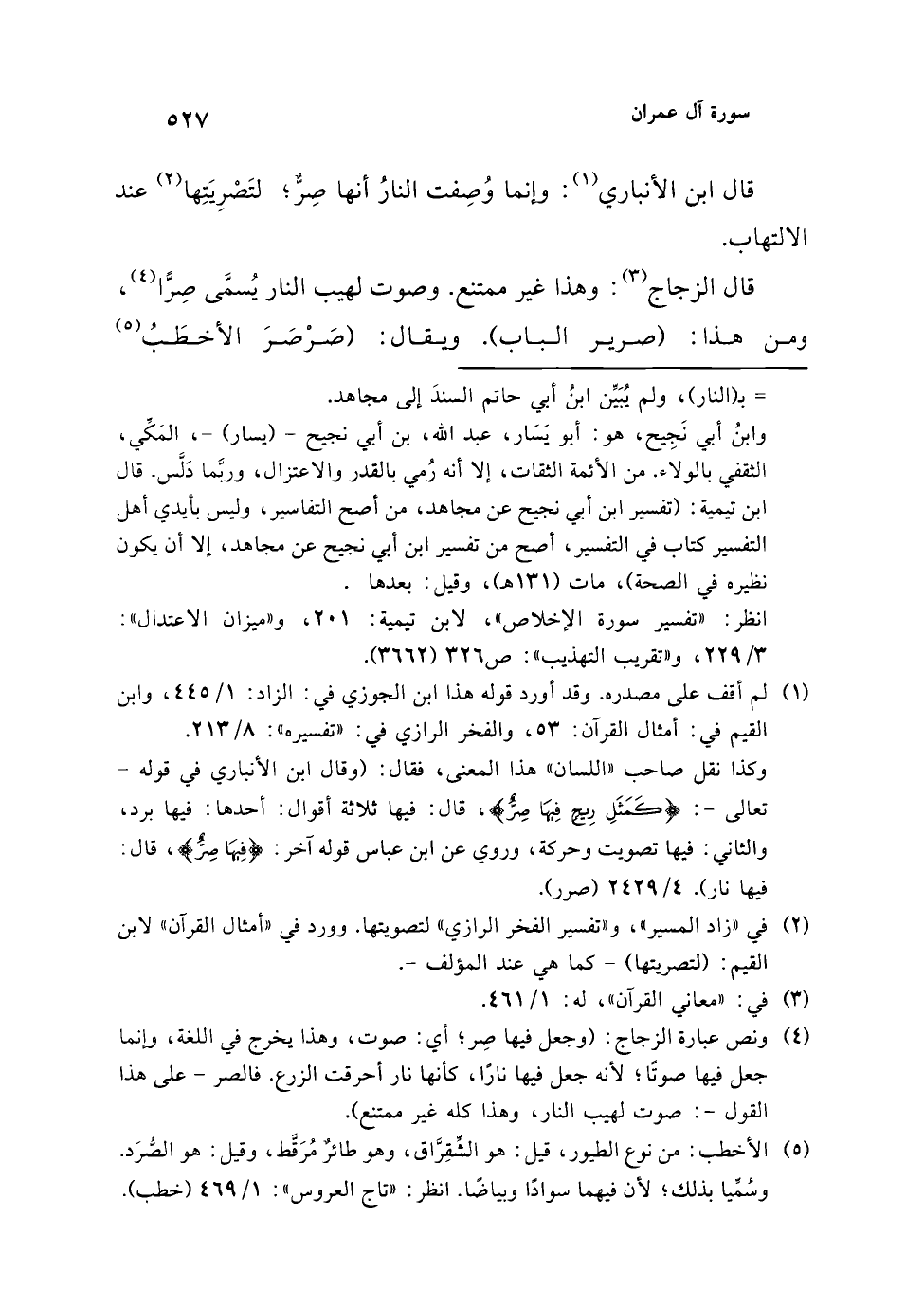 (¬4) ونص عبارة الزجاج: (وجعل فيها صِر؛ أي: صوت، وهذا يخرج في اللغة، وإنما جعل فيها صوتًا؛ لأنه جعل فيها نارًا، كأنها نار أحرقت الزرع. فالصر -على هذا القول-: صوت لهيب النار، وهذا كله غير ممتنع).