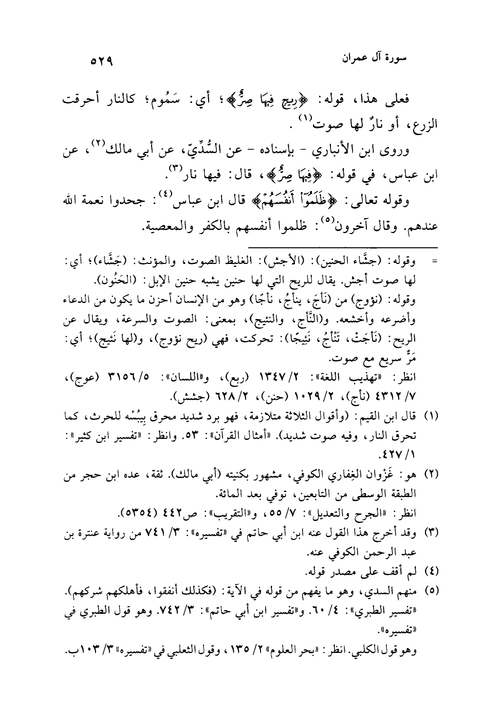 (¬1) قال ابن القيم: (وأقوال الثلاثة متلازمة، فهو برد شديد محرق بِيبُسْه للحرث، كما تحرق النار، وفيه صوت شديد). "أمثال القرآن": 53. وانظر: "تفسير ابن كثير": 1/ 427.