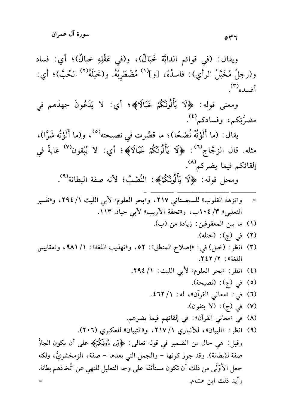 ومحل قوله: {لَا يأْلُونَكُمْ}: النَّصْبُ، لأنه صفة البطانة (¬9).