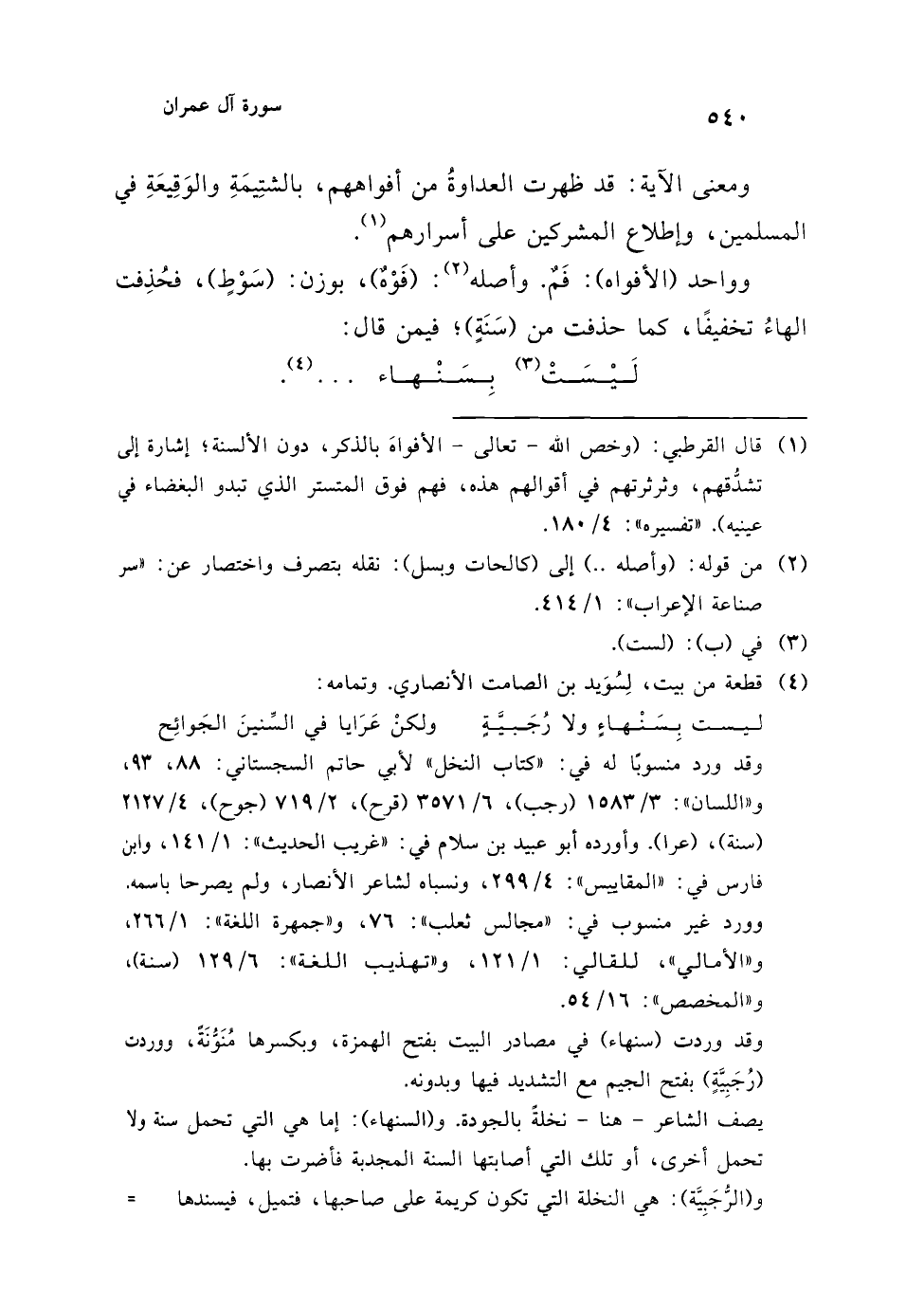 (¬1) قال القرطبي: (وخص الله -تعالى- الأفواهَ بالذكر، دون الألسنة؛ إشارة إلى تشدُّقهم، وثرثرتهم في أقوالهم هذه، فهم فوق المتستر الذي تبدو البغضاء في عينيه). "تفسيره": 4/ 180.