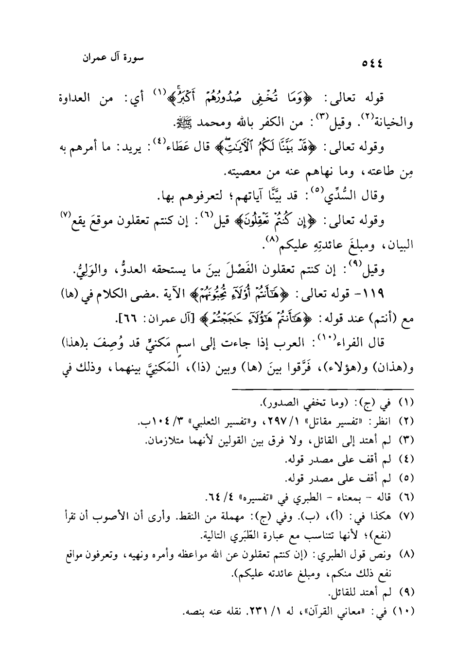 119 - قوله تعالى: {هَا أَنْتُمْ أُولَاءِ تُحِبُّونَهُمْ} الآية. مضى الكلام في (ها) مع (أنتم) عند قوله: {هَا أَنْتُمْ هَؤُلَاءِ حَاجَجْتُمْ} [آل عمران: 66].