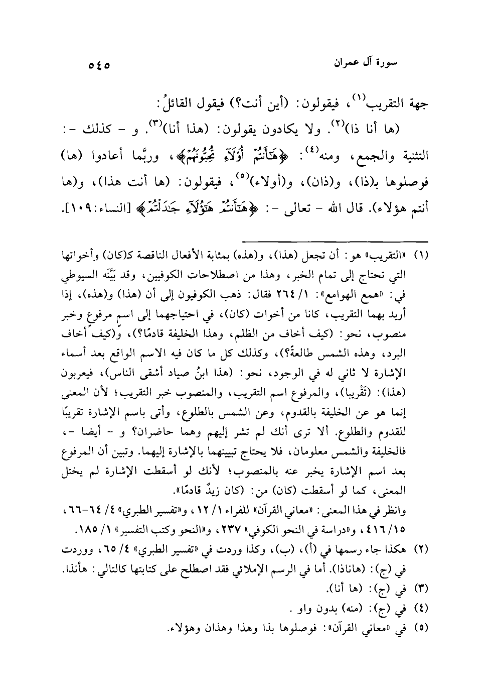 (ها أنا ذا) (¬2). ولا يكادون يقولون: (هذا أنا) (¬3). و-كذلك-: التثنية والجمع، ومنه (¬4): {هَا أَنْتُمْ أُولَاءِ تُحِبُّونَهُمْ}، وربَّما أعادوا (ها) فوصلوها بـ (ذا)، و (ذان)، و (أولاء) (¬5)، فيقولون: (ها أنت هذا)، و (ها أنتم هؤلاء). قال الله -تعالى-: {هَا أَنْتُمْ هَؤُلَاءِ جَادَلْتُمْ} [النساء: 109].