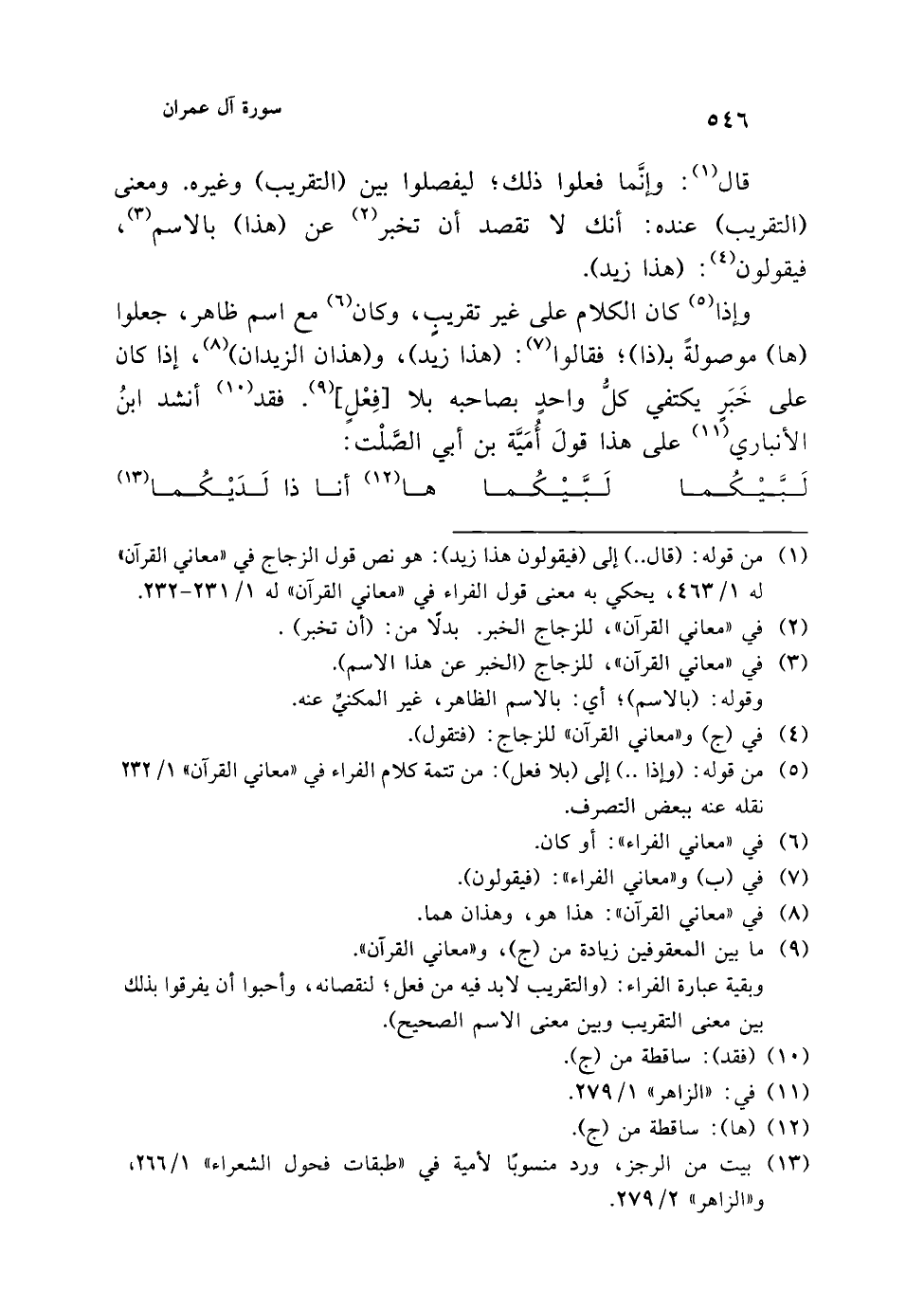 (¬1) من قوله: (قال ..) إلى (فيقولون هذا زيد): هو نص قول الزجاج في "معاني القرآن" له 1/ 463، يحكي به معنى قول الفراء في "معاني القرآن" له 1/ 231 - 232.