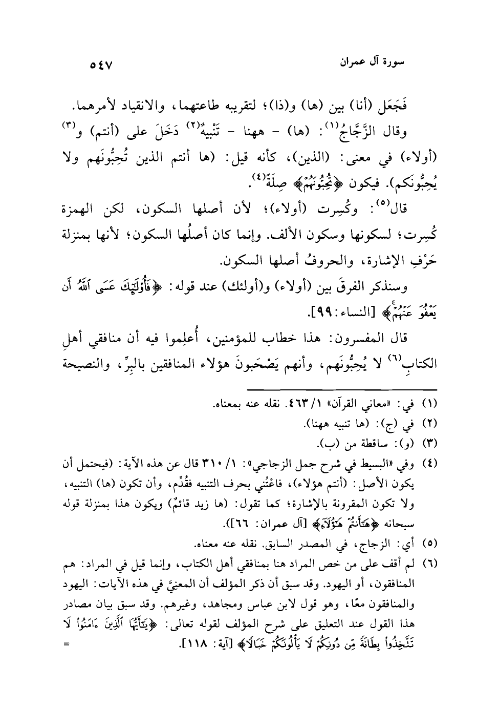 (¬4) وفي "البسيط في شرح جمل الزجاجي": 1/ 310 قال عن هذه الآية: (فيحتمل أن يكون الأصل: (أنتم هؤلاء)، فاعْتُني بحرف التنبيه فقُدِّم، وأن تكون (ها) التنبيه، ولا تكون المقرونة بالإشارة؛ كما تقول: (ها زيد قائمٌ) ولكون هذا بمنزلة قوله سبحانه {هَا أَنْتُمْ هَؤُلَاءِ} [آل عمران: 66]).