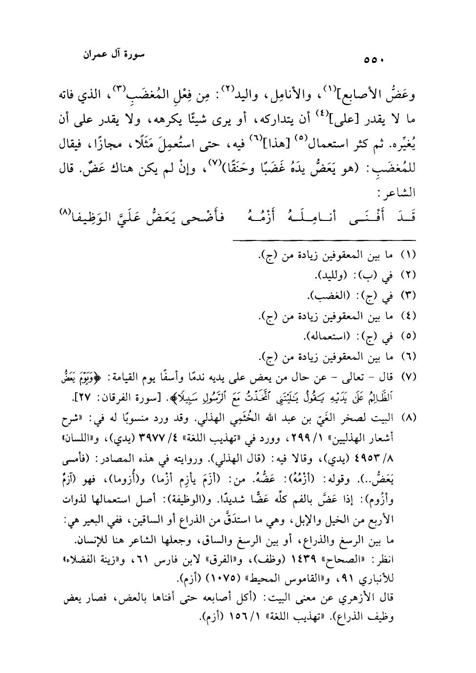 (¬8) البيت لصخر الغَيّ بن عبد الله الخُثَمِي الهذلي. وقد ورد منسوبًا له في: "شرح أشعار الهذليين" 1/ 299، وورد في "تهذيب اللغة" 4/ 3977 (يدي)، و"اللسان" 8/ 4953 (يدي)، وقالا فيه: (قال الهذلى). وروايته في هذه المصادر: (فأمسى يَعَضُّ ..). وقوله: (أزْمُهُ): عَضُّهُ. من: (أزَمَ يأزِم أزْما) و (أُزوما)، فهو (آزم وأزُوم): إذا عَضَّ بالفم كلِّه عَضًّا شديدًا. و (الوظيفة): أصل استعمالها لذوات الأربع من الخيل والإبل، وهي ما استدَقَّ من الذراع أو الساقين، ففي البعير هي: ما بين الرسغ والذراع، أو بين الرسغ والساق، وجعلها الشاعر هنا للإنسان.