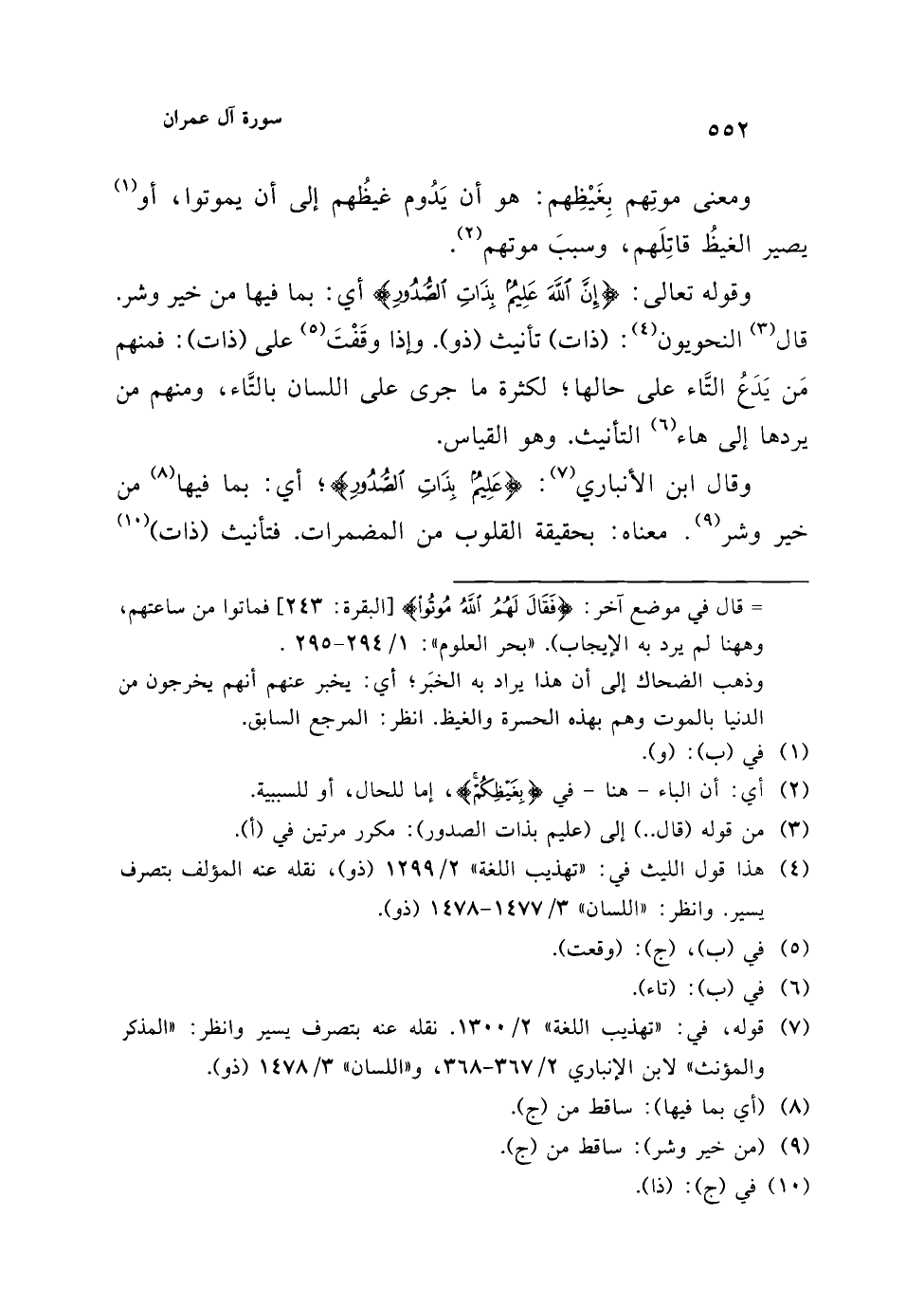 وقوله تعالى: {إِنَّ اللَّهَ عَلِيمٌ بِذَاتِ الصُّدُورِ} أي: بما فيها من خير وشر. قال (¬3) النحويون (¬4): (ذات) تأنيث (ذو). وإذا وقَفْتَ (¬5) على (ذات): فمنهم مَن يَدَعُ التَّاء على حالها؛ لكثرة ما جرى على اللسان بالتَّاء، ومنهم من يردها إلى هاء (¬6) التأنيث. وهو القياس.