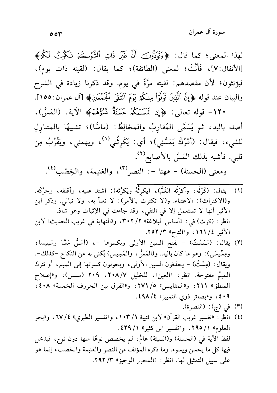 120 - قوله تعالى: {إِنْ تَمْسَسْكُمْ حَسَنَةٌ تَسُؤْهُمْ} الآية. (المَسُّ)، أصله باليد، ثم يُسَمَّى المُقارِبُ والمخالِطُ: (ماسًّا)؛ تشبيهًا بالمتناوِلِ للشيء، فيقال: (أمْرُكَ يَمَسُّنِي)؛ أي: يَكْرِثُني (¬1)، ويهمني، ويَقْرُبُ مِن قلبي. فأشبه بذلك المَسَّ بالأصابع (¬2).