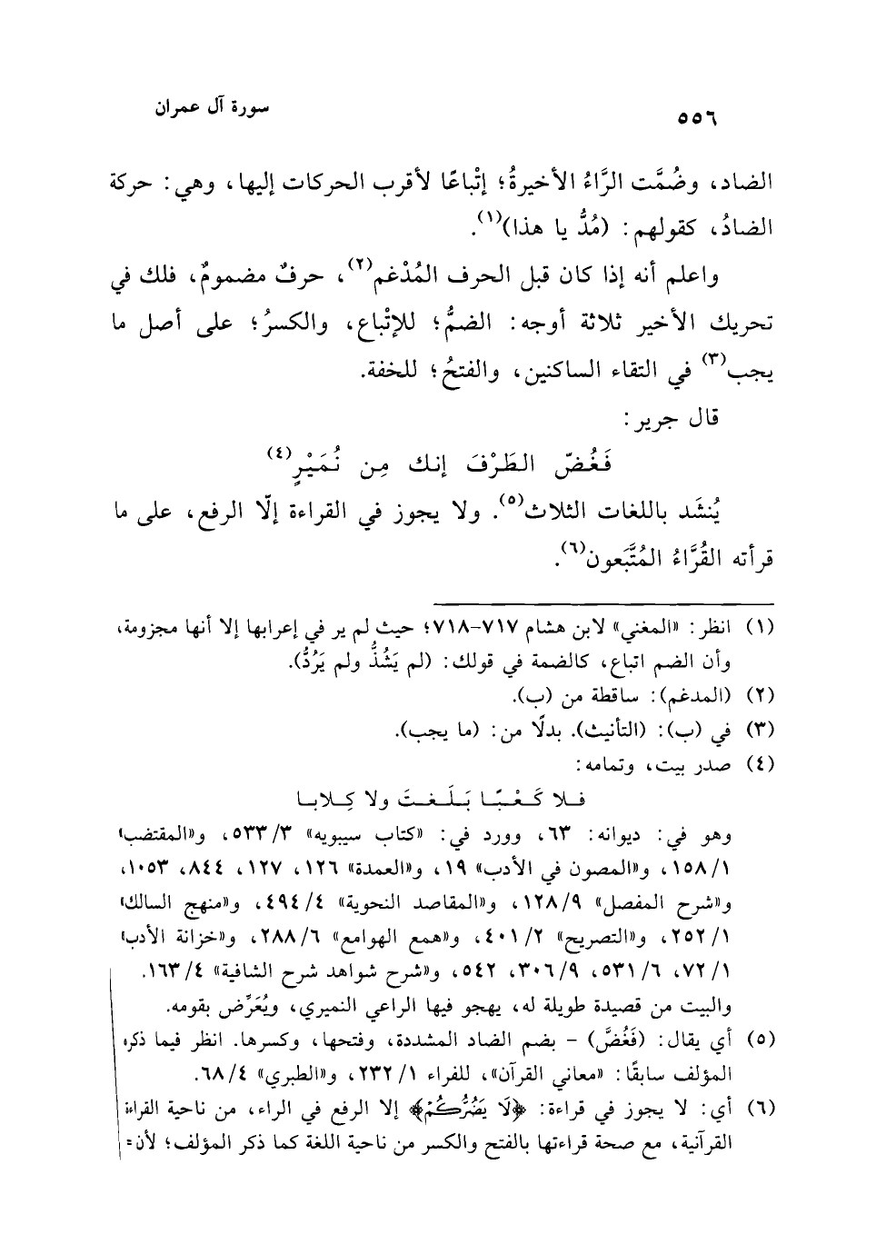 (¬1) انظر: "المغني" لابن هشام 717 - 718؛ حيث لم ير في إعرابها إلا أنها مجزومة، وأن الضم اتباع، كالضمة في قولك: (لم يَشُذُّ ولم يَرُدُّ).
