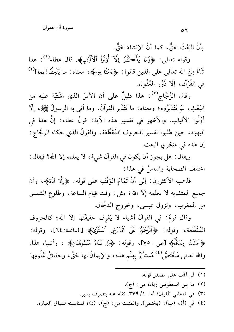 وقال الزَّجَّاج (¬3): هذا دليلٌ على أن الأمرَ الذي اشْتَبَهَ عليه من البَعْثِ، لمْ يَتَدَبَّرُوه، ومعناه: ما يَتَدَّبر القرآنَ، وما أتَى به الرسولُ - صلى الله عليه وسلم -، إلّا أوْلُوا الألباب. والأظهر في تفسير هذه الآية: قولُ عطاء: إنَّ هذا في اليهود، حين طلبوا تفسيرَ الحروف المُقَطَّعَة، والقولُ الذي حكاه الزجَّاج: إن هذه في منكري البعث.