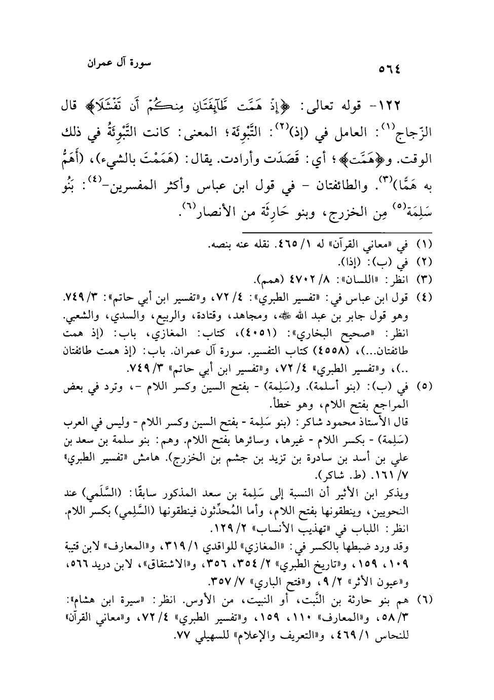 122 - قوله تعالى: {إِذْ هَمَّتْ طَائِفَتَانِ مِنْكُمْ أَنْ تَفْشَلَا} قال الزّجاج (¬1): العامل في (إذ) (¬2): التَّبْوِئَة؛ المعنى: كانت التَّبْوِئَةُ في ذلك الوقت. و {هَمَّتْ}؛ أي: قَصَدَت وأرادت. يقال: (هَمَمْتَ بالشيء)، (أَهَمُّ به هَمًّا) (¬3). والطائفتان -في قول ابن عباس وأكثر المفسرين- (¬4): بَنُو سَلِمَة (¬5) مِن الخزرج، وبنو حَارِثَة من الأنصار (¬6).