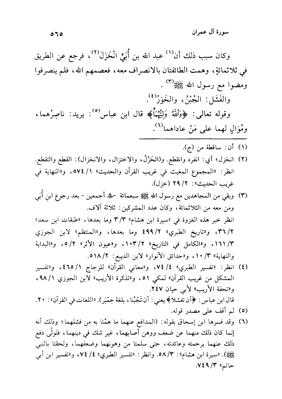 (¬6) وقد فسرها ابن إسحاق بقوله: (المدافع عنهما ما همَّتا به من فشلهما؛ وذلك أنه إنما كان ذلك منهما عن ضعف ووهن أصابهما، غير شك في دينهما، فتَولَّى دفع ذلك عنهما برحمته وعائدته، حتى سلمتا من وهونهما وضعفهما، ولحقتا بالنبي - صلى الله عليه وسلم -). "سيرة ابن هشام": 3/ 58. وانظر: "تفسير الطبري" 4/ 74، و"تفسير ابن أبي حاتم" 3/ 749.