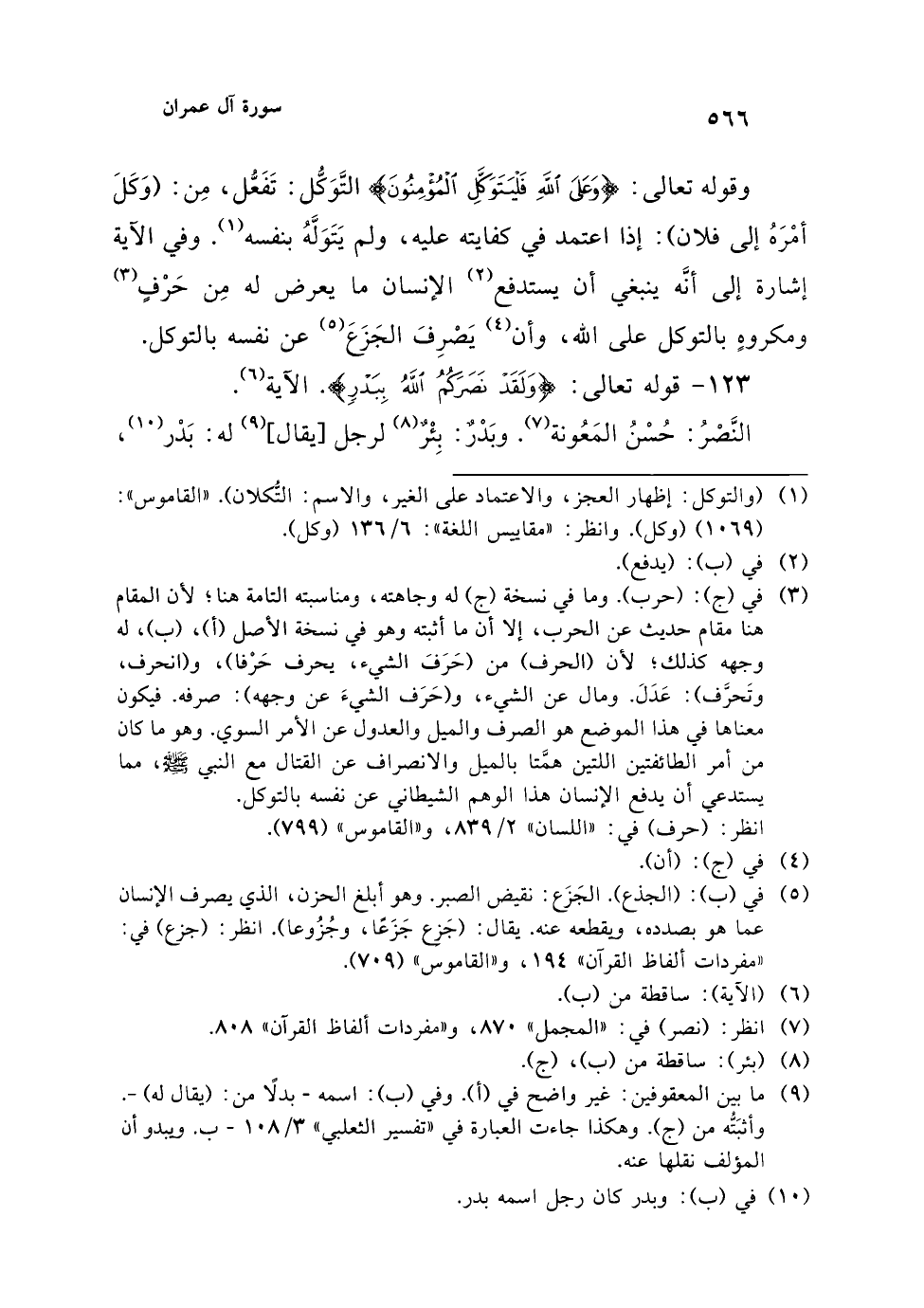 (¬3) في (ج): (حرب). وما في نسخة (ج) له وجاهته، ومناسبته التامة هنا؛ لأن المقام هنا مقام حديث عن الحرب، إلا أن ما أثبته وهو في نسخة الأصل (أ)، (ب)، له وجهه كذلك؛ لأن (الحرف) من (حَرَفَ الشيء، يحرف حَرْفا)، و (انحرف، وتَحرَّف): عَدَلَ. ومال عن الشيء، و (حَرَف الشيءَ عن وجهه): صرفه. فيكون معناها في هذا الموضع هو الصرف والميل والعدول عن الأمر السوي. وهو ما كان من أمر الطائفتين اللتين همَّتا بالميل والانصراف عن القتال مع النبي - صلى الله عليه وسلم -، مما يستدعي أن يدفع الإنسان هذا الوهم الشيطاني عن نفسه بالتوكل.