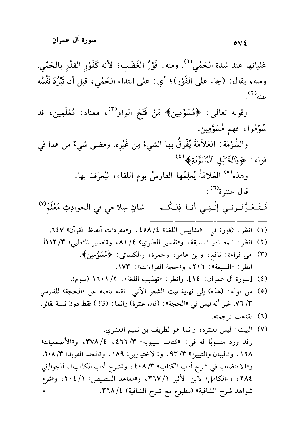 (¬5) من قوله: (هذه) إلى نهاية بيت الشعر الآتي: نقله بنصه عن "الحجة" للفارسي 3/ 76. غير أنه ليس في "الحجة": (قال عنترة) وإنما: (قال) فقط دون نسبة لقائل.