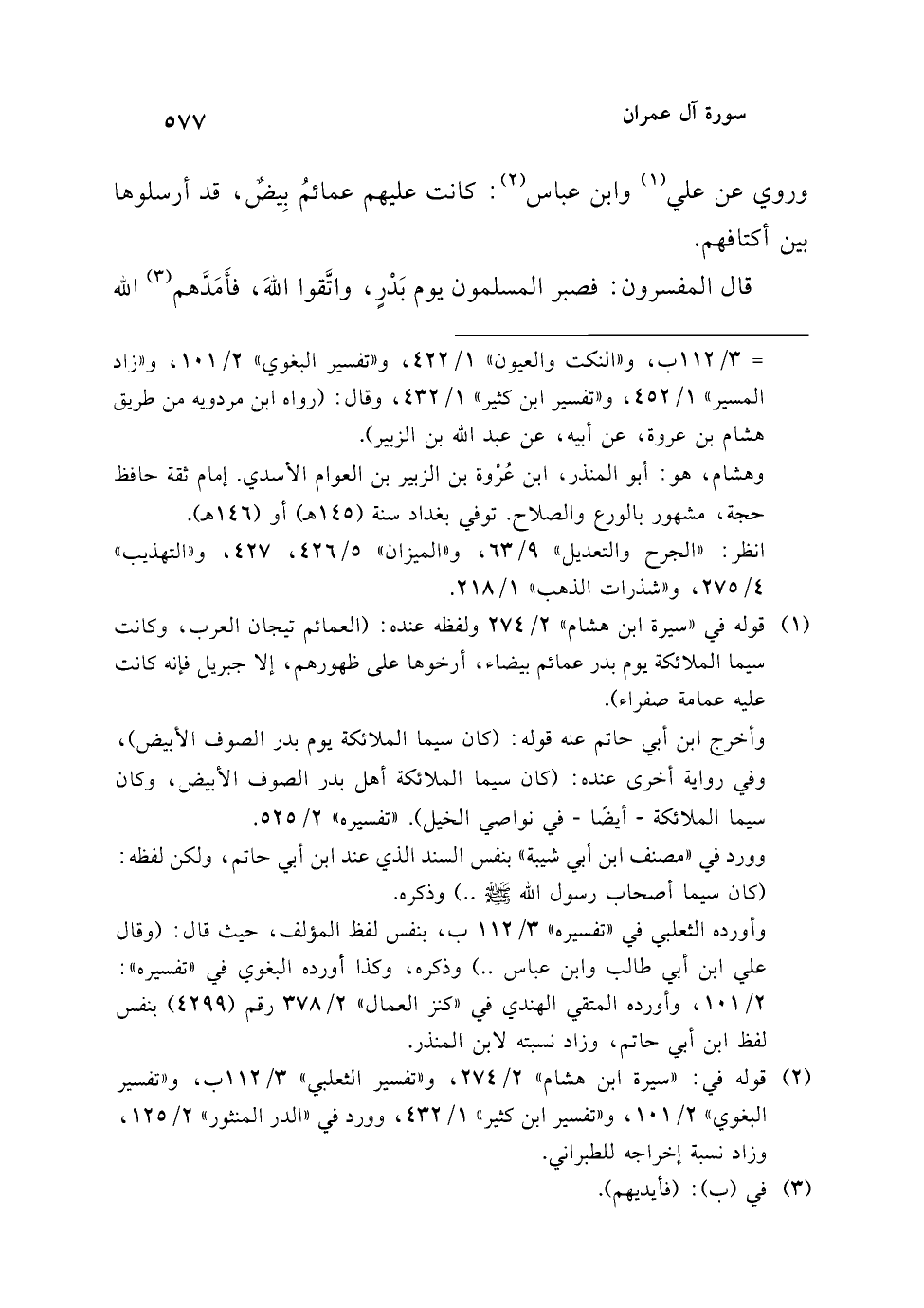 (¬1) قوله في "سيرة ابن هشام" 2/ 274 ولفظه عنده: (العمائم تيجان العرب، وكانت سيما الملائكة يوم بدر عمائم بيضاء، أرخوها على ظهورهم، إلا جبريل فإنه كانت عليه عمامة صفراء).
