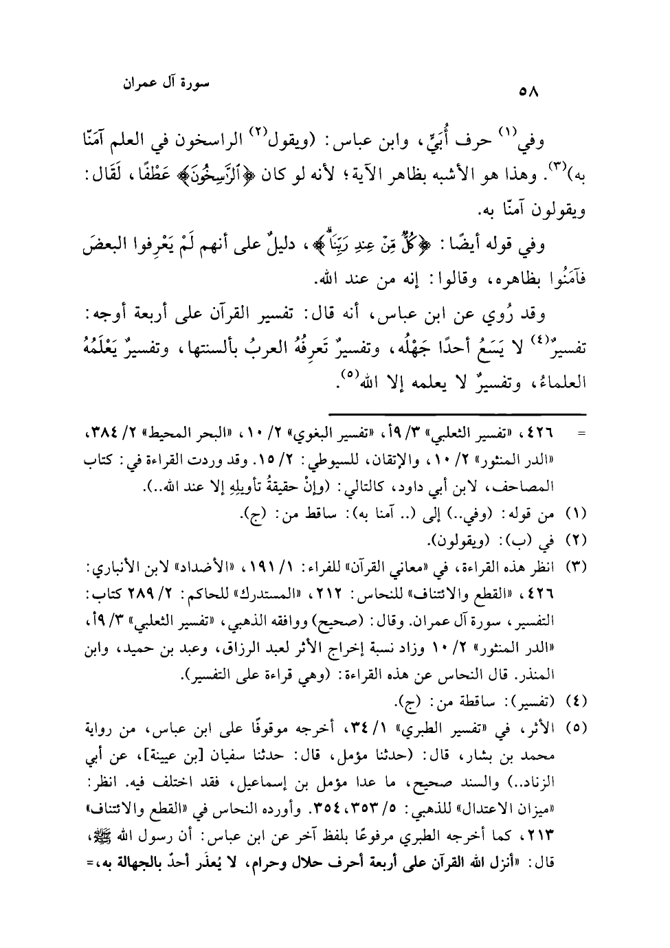 (¬5) الأثر، في "تفسير الطبري" 1/ 34، أخرجه موقوفًا على ابن عباس، من رواية محمد بن بشار، قال: (حدثنا مؤمل، قال: حدثنا سفيان [بن عيينة]، عن أبي الزناد ..) والسند صحيح، ما عدا مؤمل بن إسماعيل، فقد اختلف فيه. انظر: "ميزان الاعتدال" للذهبي: 5/ 353، 354. وأورده النحاس في "القطع والائتناف" 213، كما أخرجه الطبري مرفوعًا بلفظ آخر عن ابن عباس: أن رسول الله - صلى الله عليه وسلم -، قال: "أنزل الله القرآن على أربعة أحرف حلال وحرام، لا يُعذَر أحدٌ بالجهالة به،=