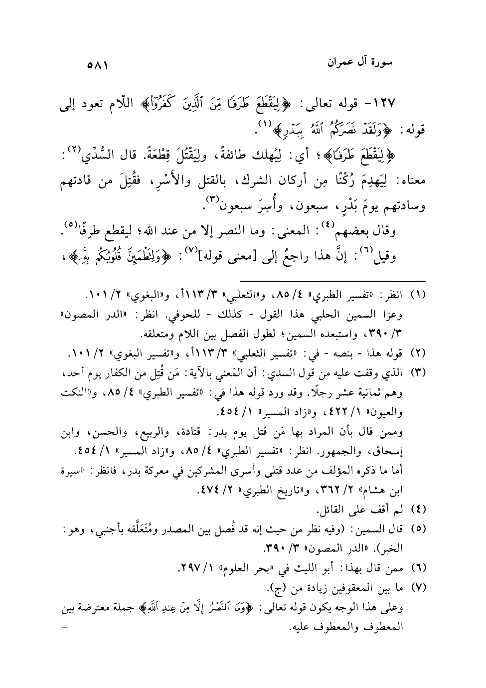 127 - قوله تعالى: {لِيَقْطَعَ طَرَفًا مِنَ الَّذِينَ كَفَرُوا} اللّام تعود إلى قوله: {وَلَقَد نَصَرَكُمُ اللَّهُ بِبَدرٍ} (¬1).